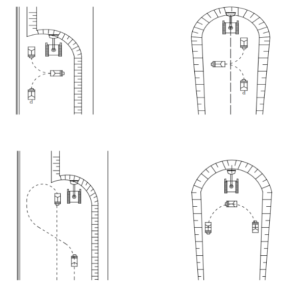 從實(shí)際的調(diào)度上來看,這個(gè)挖掘機(jī)(單斗挖掘機(jī)較多)要把礦石鏟裝到礦車上,就會(huì)涉及到一個(gè)礦車和挖掘機(jī)配合的問題,如何使得他們能合理的配合,一個(gè)礦車裝載完畢,另一個(gè)礦車就準(zhǔn)備就緒,提高采裝效率?以下是一些礦車和挖掘機(jī)的相互配合示意圖,這是幾種常見的調(diào)車方式。