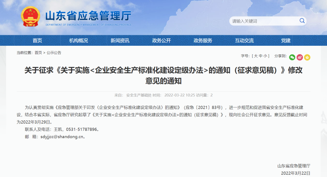山東省應急管理廳:關于實施<企業(yè)安全生產(chǎn)標準化建設定級辦法>的通知(征求意見稿)