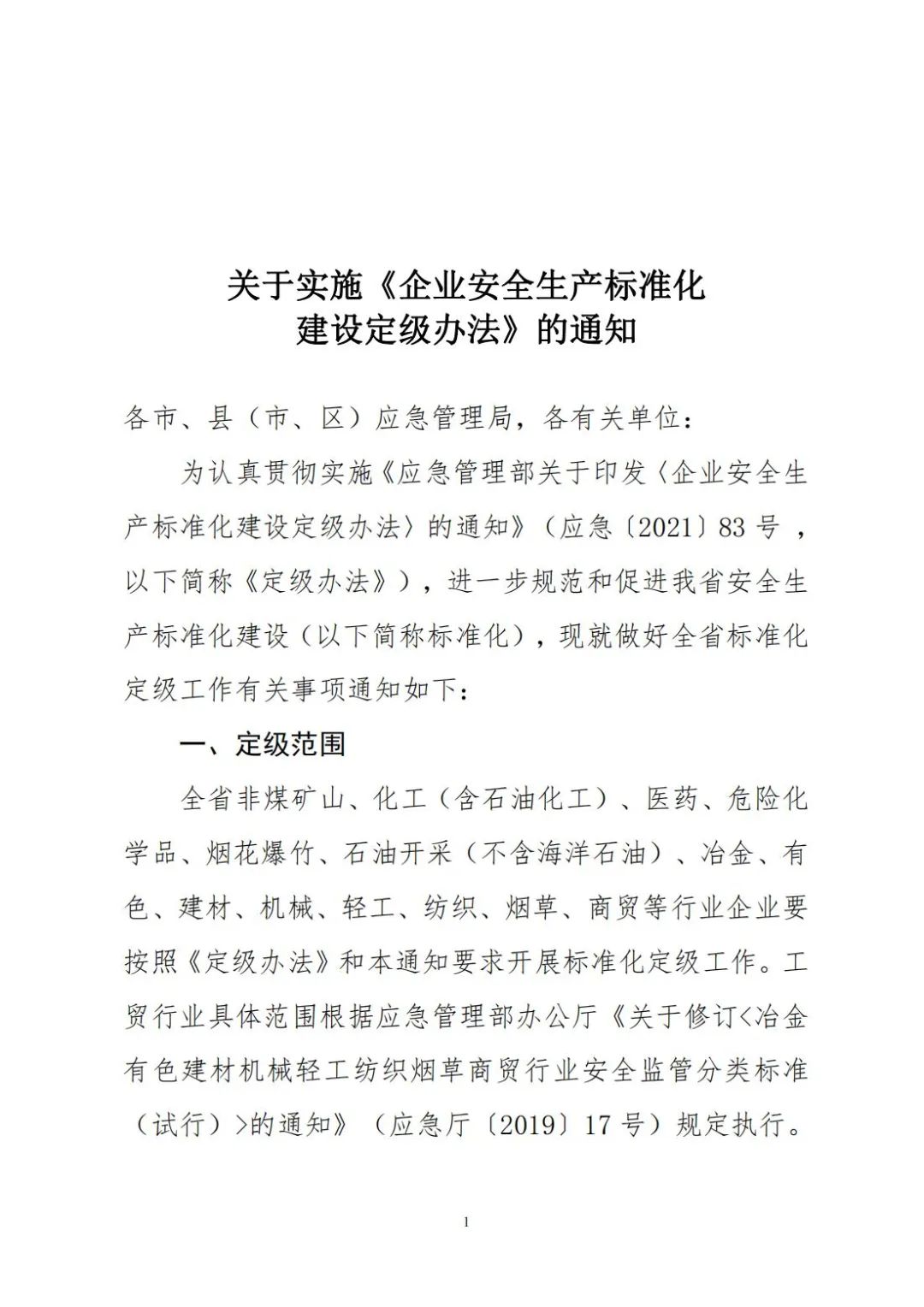 關于實施《企業(yè)安全生產(chǎn)標準化建設定級辦法》的通知