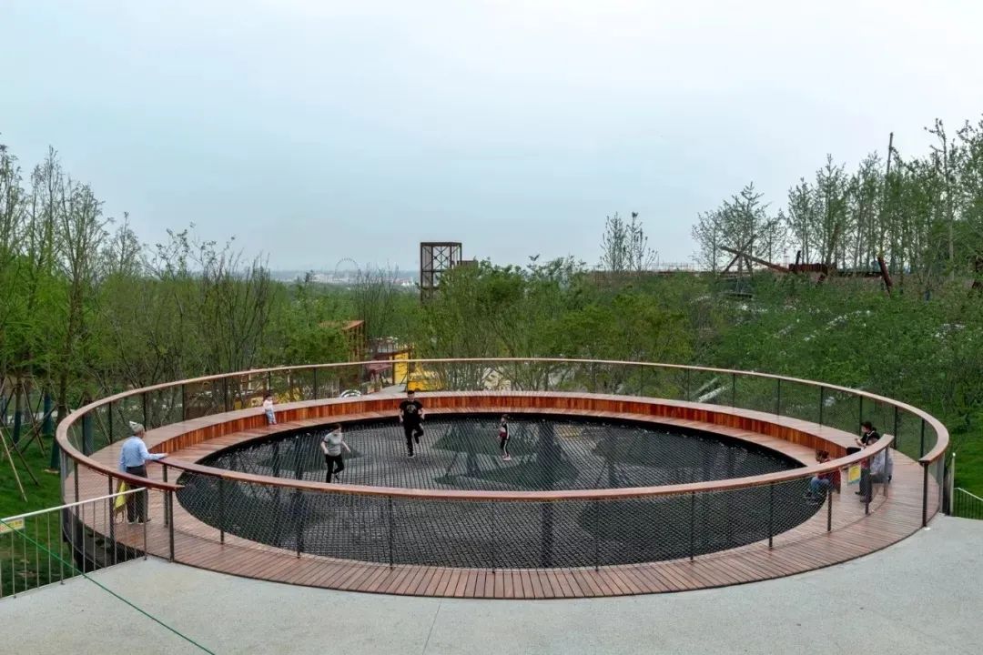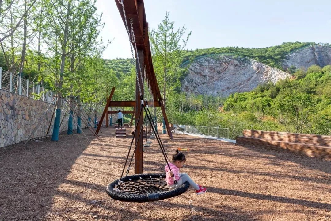 礦野拾趣樂(lè)園原為采石場(chǎng)堆放廢料的地方,原有植被和水文已被完全破壞。在恢復(fù)水文生態(tài)加固山坡基礎(chǔ)上,將攀爬、滑梯、秋千滑索、蹦床等等活動(dòng)設(shè)施組合在一起,形成礦坑特色的游憩場(chǎng)所。