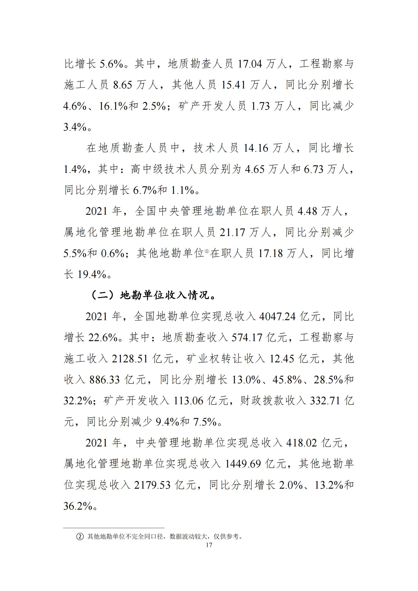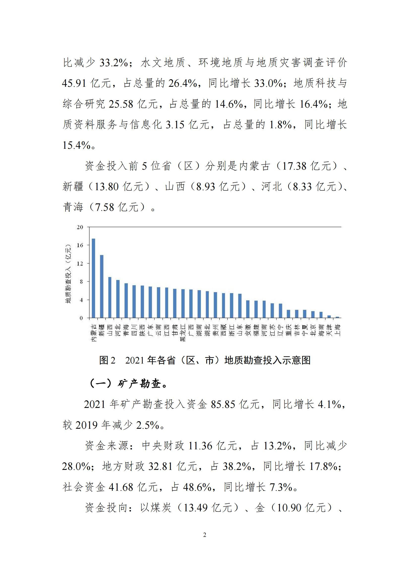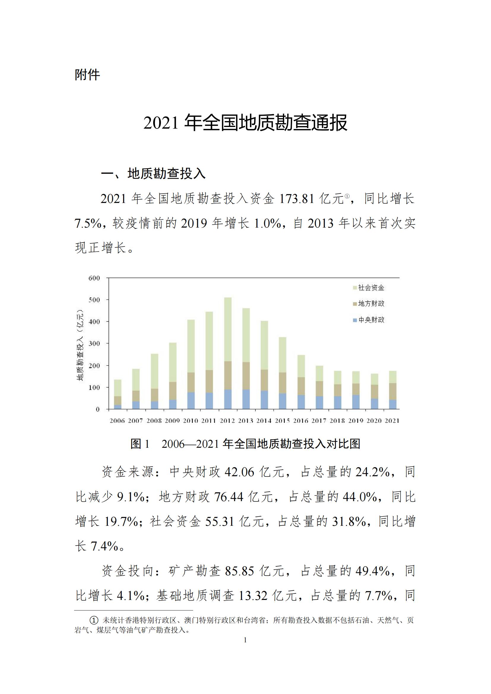 自然資源部近日發(fā)布了《2021年全國地質(zhì)勘查通報》。報告顯示,2021年全國地質(zhì)勘查投入資金達到173.81億元,同比增長7.5%,較疫情前的2019年增長1.0%,自2013年以來首次實現(xiàn)正增長。