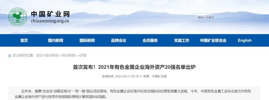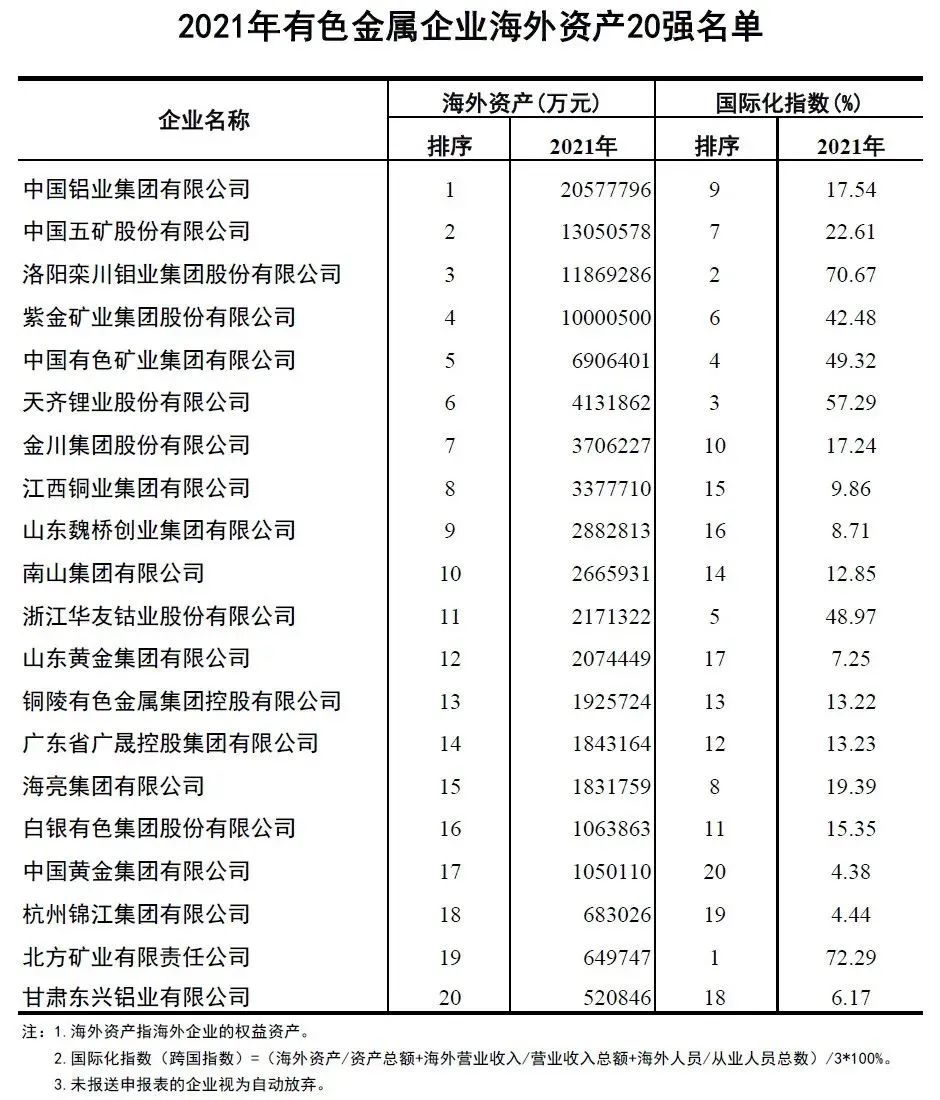 首次發(fā)布!2021年有色金屬企業(yè)海外資產(chǎn)20強(qiáng)名單出爐