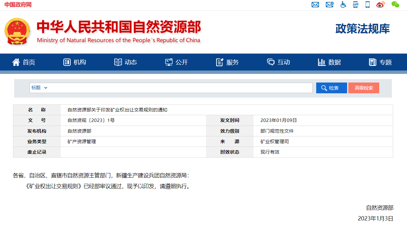 自然資源部關(guān)于印發(fā)礦業(yè)權(quán)出讓交易規(guī)則的通知