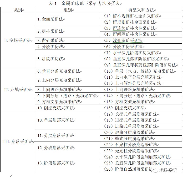 采礦方法的分類,是以回采時(shí)的地壓管理方法為依據(jù)的,因?yàn)榈貕汗芾?/span>方法是以礦石和圍巖的物理力學(xué)性質(zhì)為根據(jù),同時(shí)又與采礦方法的使用條件、結(jié)構(gòu)和參數(shù)、回采工藝等有密切關(guān)系,并且最終將影響到開采的安全、效率和經(jīng)濟(jì)效果。因此,以此為依據(jù)可將采礦方法劃分為三大類(表1)