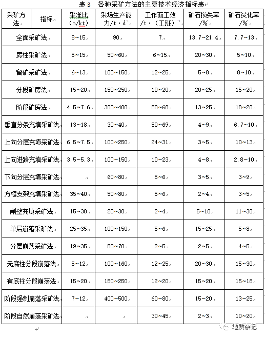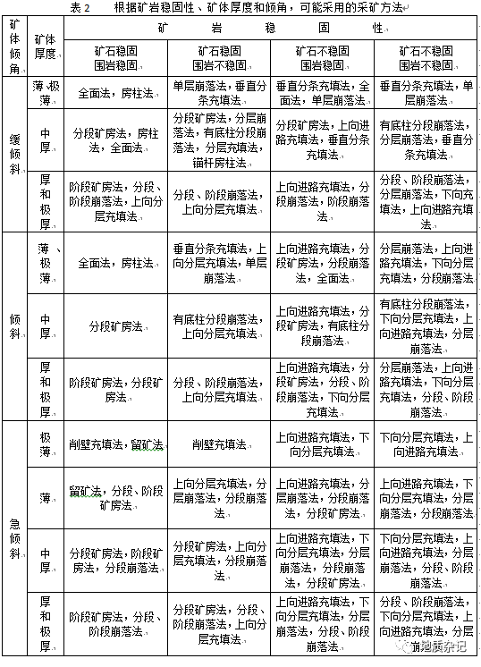 第一類,空?qǐng)霾傻V法。此法將礦塊劃分為礦房和礦柱,分兩步驟開采;夭傻V房時(shí)所形成的采空區(qū),可利用礦柱和礦巖本身的強(qiáng)度進(jìn)行維護(hù)。因此,礦石和圍巖均穩(wěn)固,是使用本類采礦方法的基本條件。在回采礦房時(shí)期暫留礦石的留礦發(fā)也劃歸本類,是因?yàn)闀毫舻V石不能作為支撐圍巖的主要手段,且當(dāng)其放出后的一定時(shí)間內(nèi),仍靠礦柱維護(hù)采空區(qū)。因此,留礦不能作為獨(dú)立的地壓管理方法,不應(yīng)單分一類。第二類,充填采礦法。本類的大部分采礦方法,也是分為兩步驟進(jìn)行回采;夭傻V房時(shí),隨回采工作面的推進(jìn),逐步用充填料充填采空區(qū),防止圍巖片落,即用充填采空區(qū)的方法管理地壓。個(gè)別條件下,還用支架和充填料配合維護(hù)采空區(qū),進(jìn)行地壓管理。因此,礦石和圍巖穩(wěn)固和不穩(wěn)固,均可應(yīng)用本類采礦法。 第三類,崩落采礦法。本類采礦法為一個(gè)步驟回采,并且隨回采工作面的推進(jìn),同時(shí)崩落圍巖充滿采空區(qū),從而達(dá)到管理和控制地壓的目的。因此,崩落圍巖充滿采空區(qū),是應(yīng)用本類采礦方法的必要前提。礦巖的穩(wěn)固性,對(duì)選擇采礦方法及地壓管理方法,均有很大的影響。根據(jù)礦石或巖石的穩(wěn)固程度,可分為以下五種情況:1. 極不穩(wěn)固的 是指掘進(jìn)巷道或開辟采場(chǎng)時(shí),不允許有暴露面積,否則可能產(chǎn)生片幫或冒落現(xiàn)象。在掘進(jìn)巷道時(shí),需用超前支護(hù)方法進(jìn)行維護(hù)。2. 不穩(wěn)固的 在這類礦石或巖石中,允許有較小的不支護(hù)的暴露空間,一般允許的暴露面積在50m²以內(nèi)。3. 中等穩(wěn)固的 是指不支護(hù)的暴露面積為50~200 m²。4. 穩(wěn)固的 允許不支護(hù)的暴露面積為200~800 m²。5. 極穩(wěn)固的 不需支護(hù)的暴露面積在800 m²以上。金屬礦床的分類,一般按其礦體形狀、傾角和厚度三個(gè)因素進(jìn)行分類。一、按礦體形狀分類:1. 層狀礦床;2. 脈狀礦床;3. 塊狀礦床。 正確合理的采礦方法必須滿足以下幾點(diǎn)要求:1.安全;2.礦石貧化。3.礦石回采率高;4.生產(chǎn)效率高;5.經(jīng)濟(jì)效益高;6.遵守有關(guān)法規(guī)要求。影響采礦方法選擇的主要因素有兩個(gè)方面:(1)礦體地質(zhì)條件;(2)開采技術(shù)經(jīng)濟(jì)條件。全面系統(tǒng)地分析礦石和圍巖穩(wěn)固性,有條件時(shí)進(jìn)行礦床的穩(wěn)固性分類,根據(jù)不同的穩(wěn)固性類型分別進(jìn)行采空區(qū)允許體積、礦體和圍巖允許暴露面積評(píng)價(jià)。同時(shí)可輔助以巖石力學(xué)數(shù)值計(jì)算方法進(jìn)行采場(chǎng)穩(wěn)定性分析。