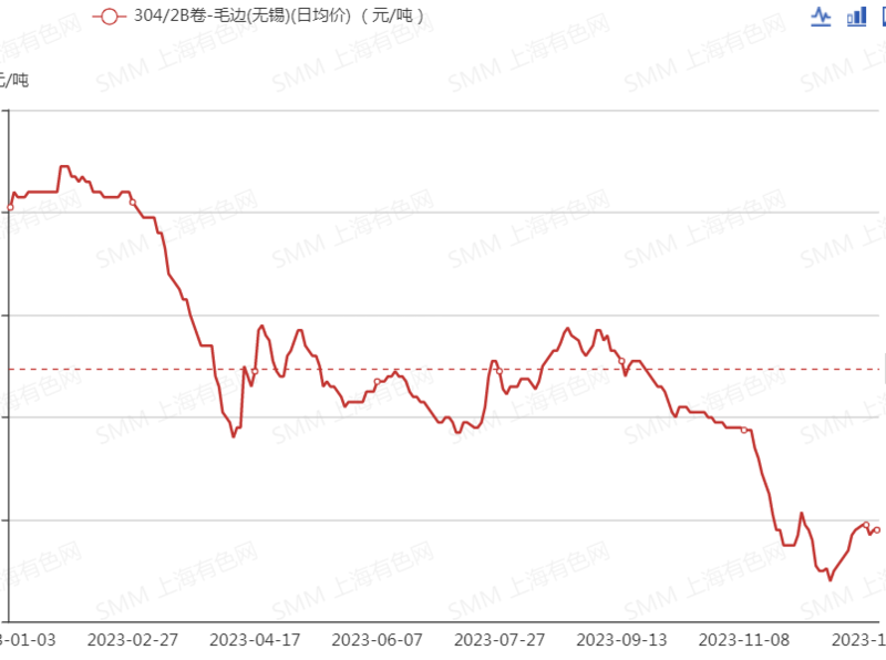 2023年304/2B卷-毛邊(無錫)現(xiàn)貨均價整體呈震蕩走弱的趨勢,年內(nèi)最大跌幅為23.21%,年度跌幅為18.71%。