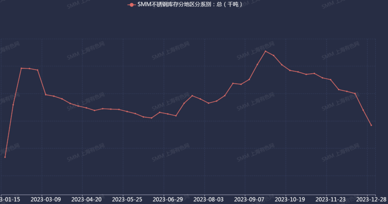 庫存:據(jù)SMM數(shù)據(jù)顯示,2023年國內(nèi)不銹鋼分地區(qū)分系別總庫存呈震蕩走勢變化,9月21日庫存觸及2021年3月以來新高后持續(xù)去庫,12月28日庫存為74.2萬噸,刷2023年1月以來新低,環(huán)比減約3.62%,同比增9.34%。2023年不銹鋼產(chǎn)量以及表觀消費同比增加較多,社會庫存同比增加屬于正常現(xiàn)象。