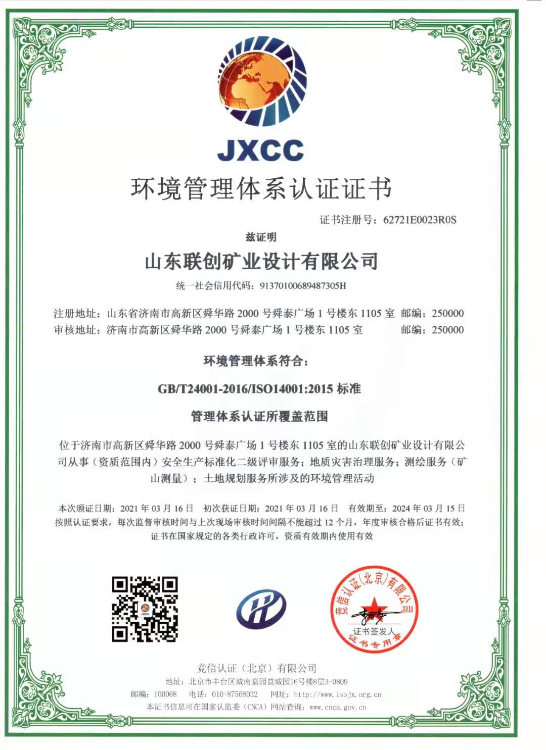 環(huán)境管理體系認(rèn)證證書